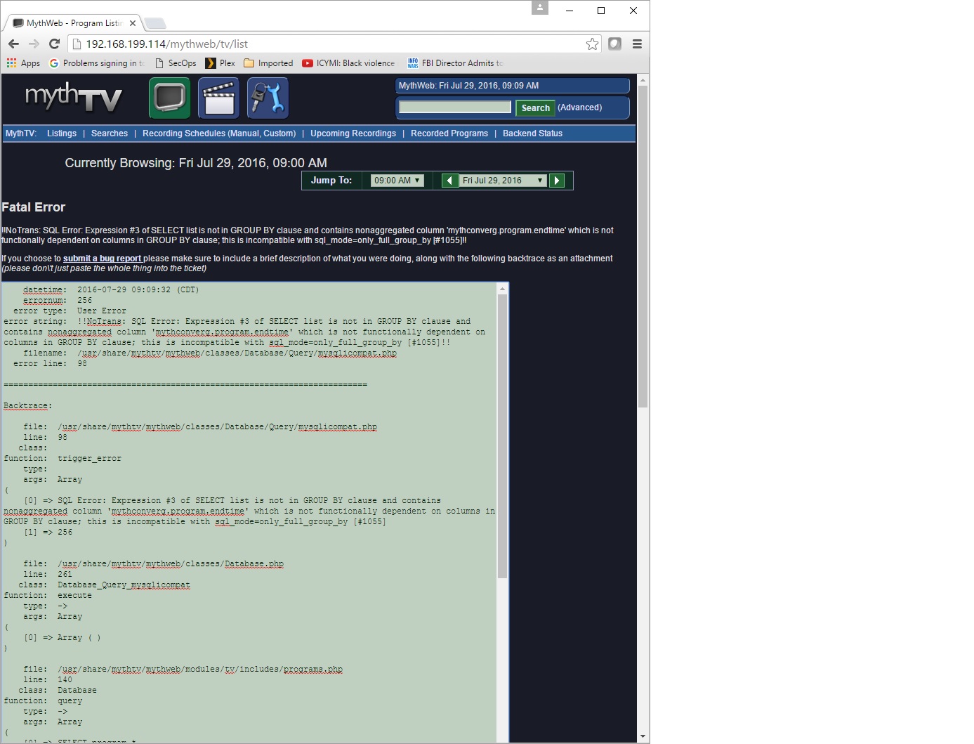 error string: !NoTrans: SQL Error: Expression #3 of SELECT list is not in GROUP BY clause and contains nonaggregated column 'mythconverg.program.endtime' which is not functionally dependent on columns in GROUP BY clause; this is incompatible with sql_mode=only_full_group_by #1055!!