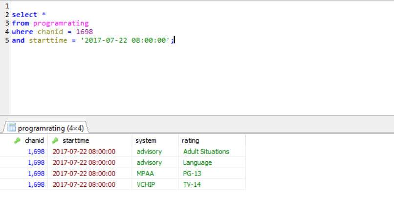 WHERE program.chanid=1698 AND program.starttime = '2017-07-22 08:00:00'
