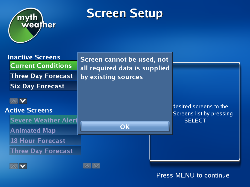 When trying to add current conditions to the screens to view the attempt fails with a popup box that says "Screen cannot be used, not all data is supplied by existing sources."