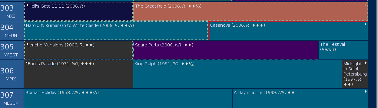 The movies on channels 303-305 are covered by a custom rule to record all movies on those channels. When you mouse over them it claims the original air date is 2006-10-03, which is the day I'm looking at. The movies on the other channels are not part of a rule. They show the correct year.