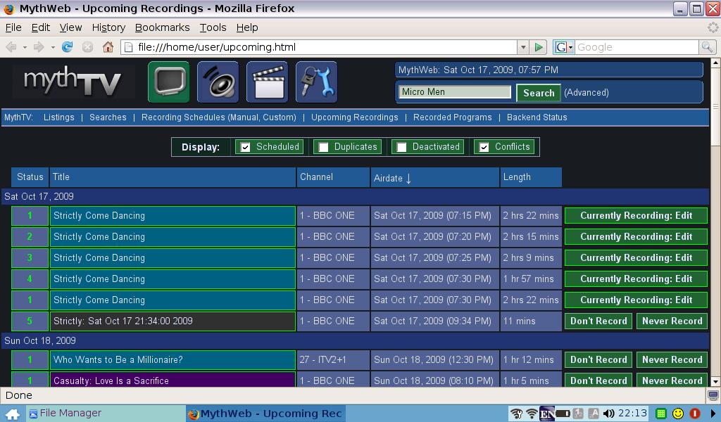 A screenshot of the upcoming recordings in Mythweb at this point is here (plus a manually scheduled recording on tuner 5 to catch the delayed ending):